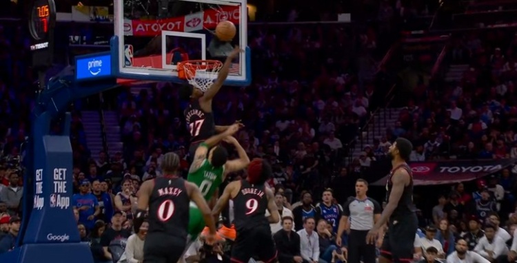 球已经下落了!埃奇库姆补防大帽塔图姆上篮被吹干扰球